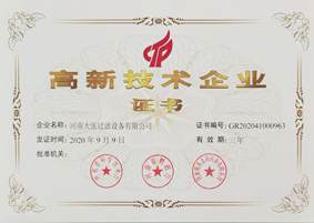 2020年9月9日——河南大張過(guò)濾設(shè)備有限公司榮獲“高新技術(shù)企業(yè)”證書(shū)